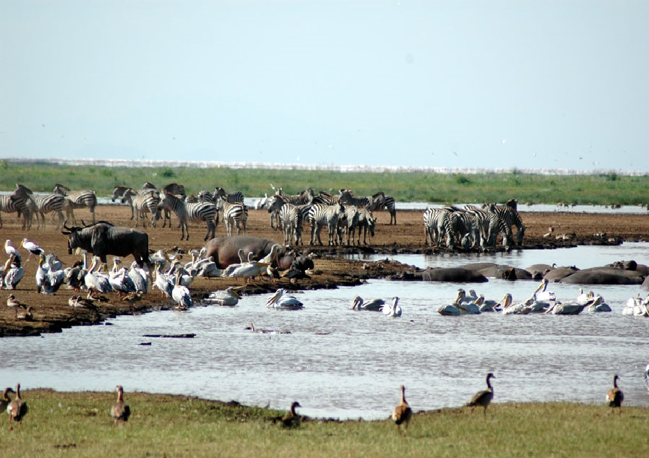Lake Manyara is a shallow lake in the the East Aftican Rift said by Ernest Hemingway to be the "loveliest [lake] ... in Africa,". It is also the home of a diverse set of landscapes and wildlife. While most known for baboons, the lake and its environs is also home to herbivores such as hippos, impalas, elephants, wildebeests, buffalo, warthogs and giraffes. Lake Manyara provides opportunities for ornithologists keen on viewing and observing over 300 migratory birds, including flamingo, Long-crested Eagle and Grey-headed Kingfisher.